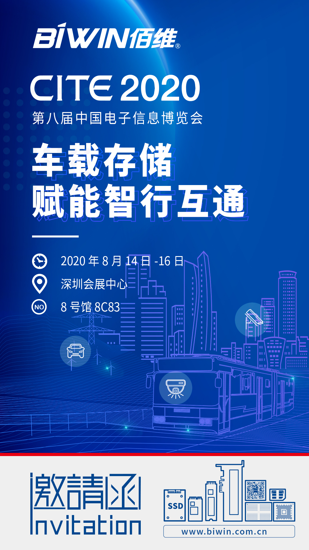 2020年8月14日-8月16日,第八屆中國電子信息博覽會(CITE 2020)將在深圳會展中心舉辦,此次博覽會共有9個展館,其中智能網聯與新能源汽車領域備受關注。作為國內領先的存儲芯片全案提供商,佰維受邀參展并以“車載存儲·賦能智行互通”為主題,全面展示在車載領域的存儲解決方案。
