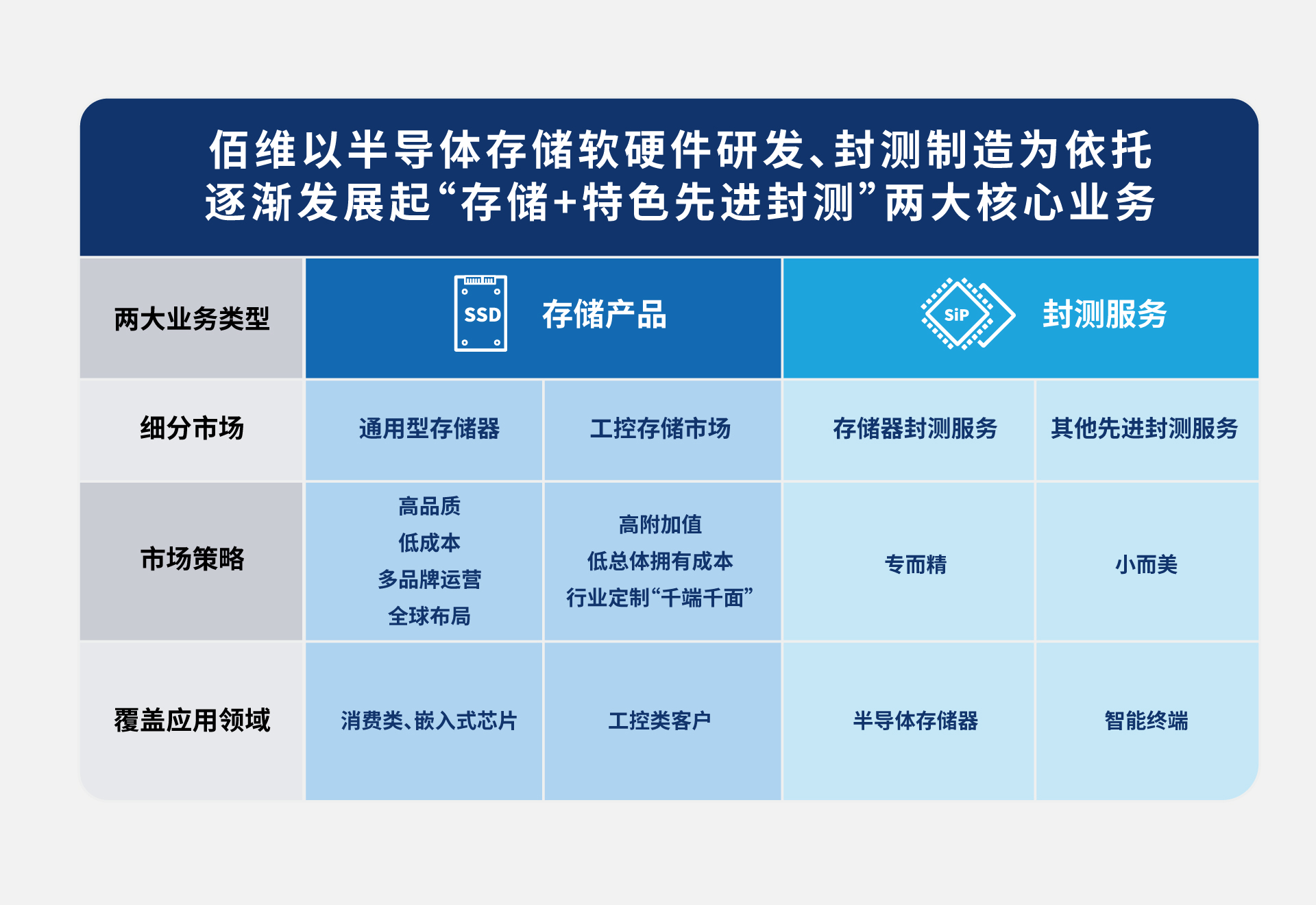佰維多年來專精于半導體存儲器的創新研發與封測制造,布局了全系列、全容量、全場景應用的存儲產品線矩陣,涵蓋了標準化、規模化的通用型存儲器以及“千端千面”的行業定制化方案,最終實現從客戶端需求開發到最終產品端量產的一站式交付能力。佰維是國內最早布局封測制造的存儲企業,優異的封測制造工藝賦予了公司更靈活的和快速響應的定制化優勢,通過研發與封測實力不斷賦能存儲芯片小型化、大容量與低功耗,進而滿足終端設備日益輕薄與高集成度的需求。