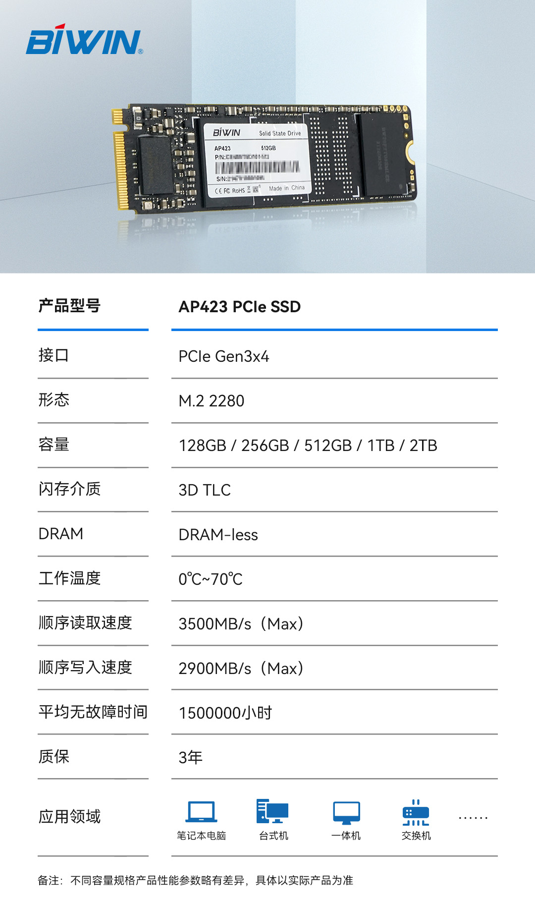 佰維AP423系列PCIe SSD采用標準的M.2 2280規格,接口支持PCIe 3.0x4,NVMe 1.4協議,最大容量2TB,持續讀寫速度最高分別為3.5GB/s、2.9GB/s,同時采用低功耗的DRAM-less設計,擁有HMB、數據巡檢、電源管理等眾多功能。