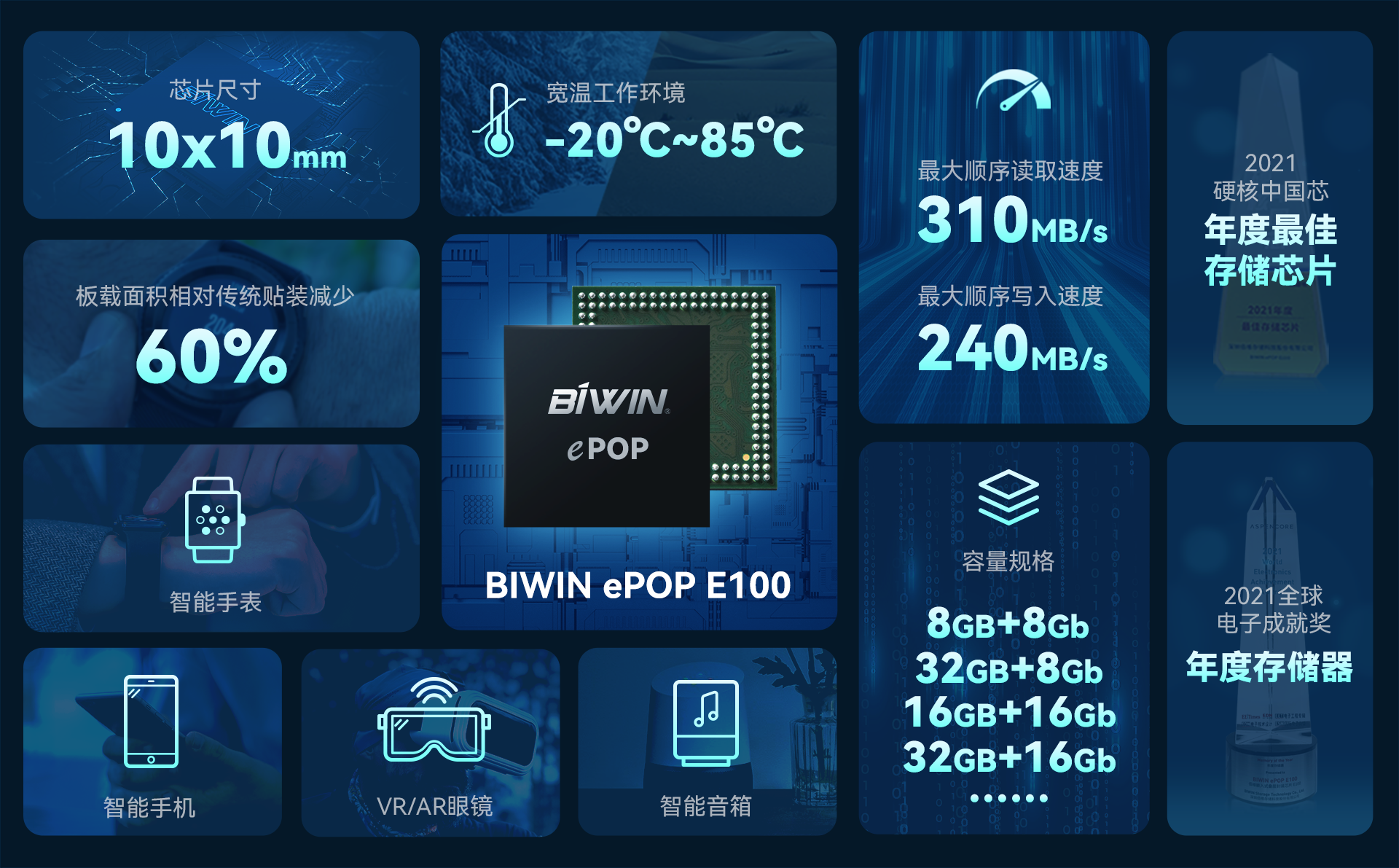 值得一提的是,佰維ePOP芯片E100系列屢獲業(yè)界嘉獎,斬獲“2021 年全球電子成就獎年度存儲器”、“2021 年度硬核中國芯最佳存儲芯片”諸多殊榮。佰維eMCP與eMMC、UFS、BGA SSD、LPDDR、MCP、SPI NAND等存儲芯片,通過通用型和定制化產(chǎn)品的輸出,共同構(gòu)建了公司豐富的嵌入式存儲芯片解決方案,持續(xù)為智能終端客戶提供有競爭力的存儲產(chǎn)品。