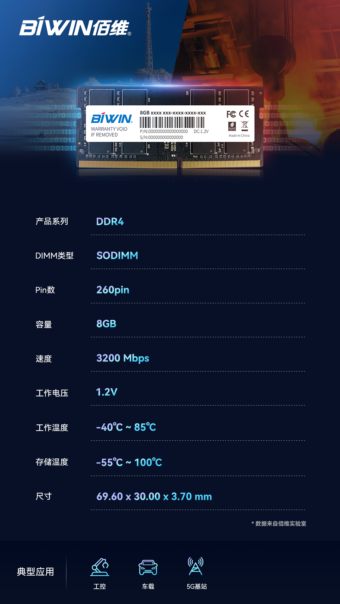 聚焦5G基站、邊緣計算、AI設備、車載應用、工控安防等領域,越來越多的工業類應用及設備對存儲解決方案提出了更高要求:長時間持續高速運算及嚴苛的運作環境下,存儲產品必須擁有高穩定性、高可靠性,也必須經過適應極端溫度變化、防塵、抗震動、抗沖擊、抗硫化等種種考驗,從而保持高耐久度和長使用壽命。近期,佰維推出工業級寬溫SODIMM內存條,賦能嚴苛環境挑戰下的各種工業應用。