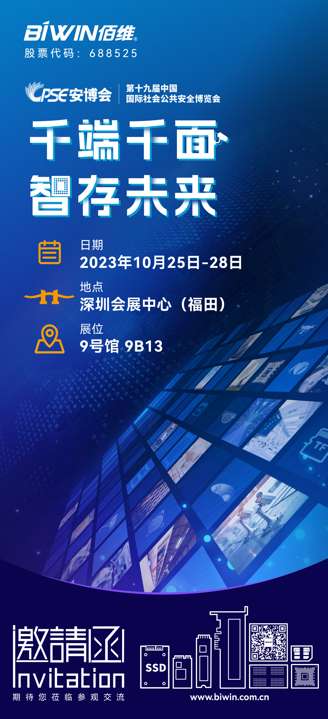 10月25日至28日,為期4天的第十九屆中國國際社會公共安全博覽會(簡稱:安博會)將在深圳會展中心(福田)盛大舉行,佰維將亮相安博會并重點展示G系列工業級寬溫SSD、數據采集盤、軌道交通存儲、工規嵌入式存儲、智慧城市存儲等存儲解決方案。