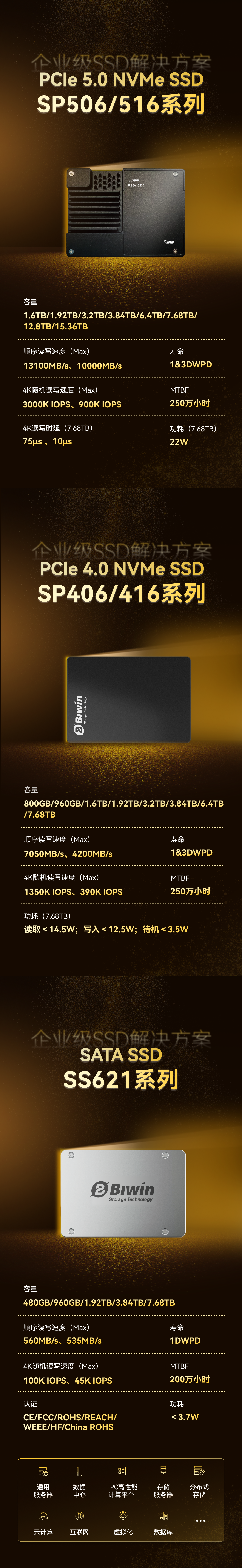 依托長期積累形成的綜合技術實力和先進封測制造能力,佰維構建了豐富齊備的企業級SSD+RDIMM產品線,涵蓋高性能企業級PCIe 4.0/5.0 NVMe SSD、SATA SSD、DDR5/DDR4 RDIMM以及CXL 2.0內存擴展模塊。系列產品兼顧高吞吐量、高IOPS、低延遲、優異的QoS特性、高密度以及成本效益,兼容Intel、AMD以及鯤鵬、海光、龍芯、飛騰、兆芯、申威等服務器系統,能夠適應各種企業級讀寫密集型和混合應用場景,滿足云計算和大規模數據中心數據高速傳輸、快速響應、高效分析等需求,覆蓋各行業業務場景AI應用,產品性能和品質獲得行業類客戶及市場的廣泛認可。其中,佰維企業級PCle 5.0 SSD——SP506/516系列產品榮獲了DOIT AWARD 2024存儲風云榜“2024年度企業級固態盤產品金獎”。