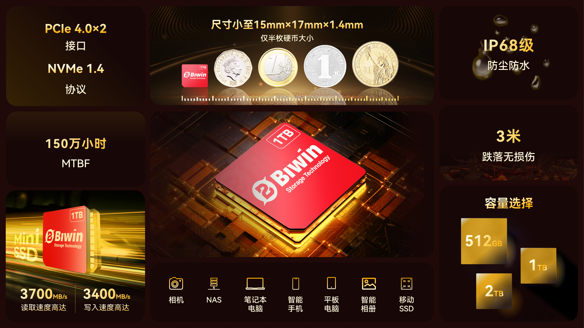 展會上,佰維還發布了全新一代Mini SSD,產品采用了LGA先進封裝技術,實現主控與閃存的高度集成,突破了傳統SSD體積限制,尺寸小至15mm×17mm×1.4mm,與半枚硬幣體積相當。同時,產品采用PCIe 4.0×2接口、支持NVMe 1.4協議,讀寫速度分別高達3700MB/s、3400MB/s,容量范圍覆蓋512GB~2TB,廣泛兼容并滿足筆記本電腦、平板電腦、智能手機、相機、NAS、智能相冊及移動固態硬盤等多種場景的高效存儲需求,賦能端側智能時代。
